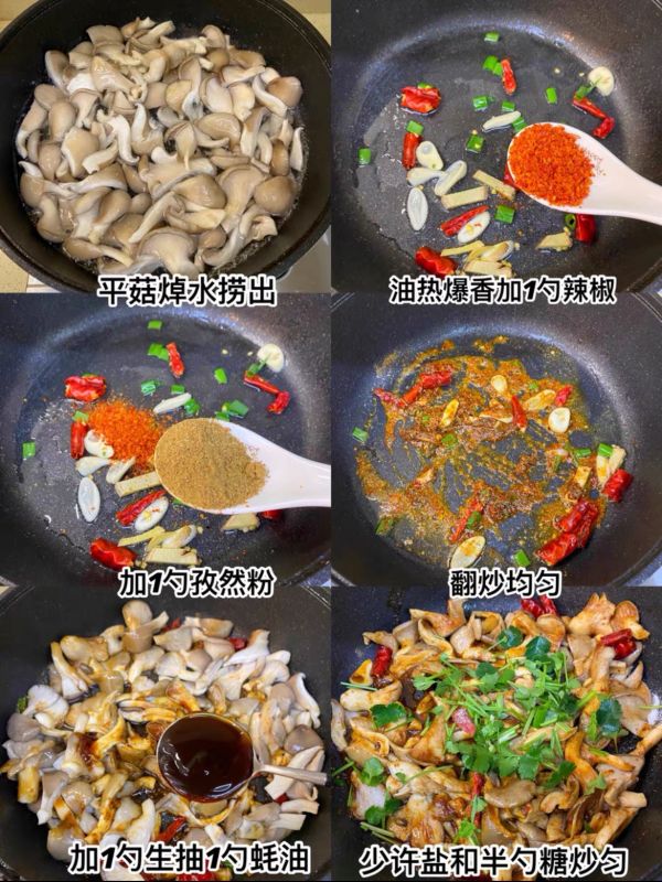 1⃣️平菇洗净撕小朵,水开下锅煮2分钟焯水捞出 2⃣️油热葱姜蒜干辣椒爆香,加1勺辣椒粉、1勺孜然粉翻炒均匀,放平菇翻炒;加1勺生抽、1勺蚝油、少许盐和半勺白糖,放香菜翻匀出锅啦!