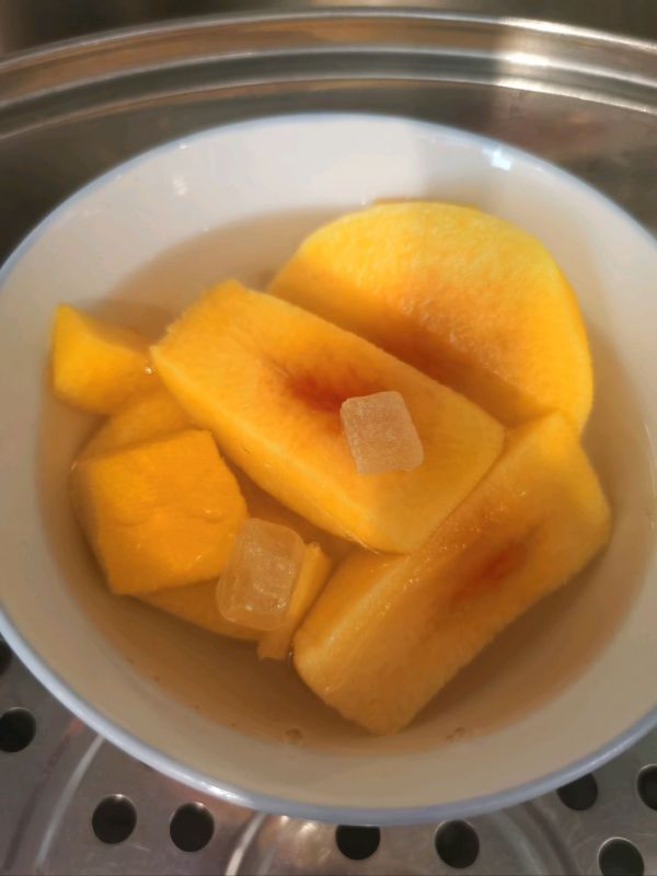 黄桃罐头去皮切块,放入碗中,加入纯净水