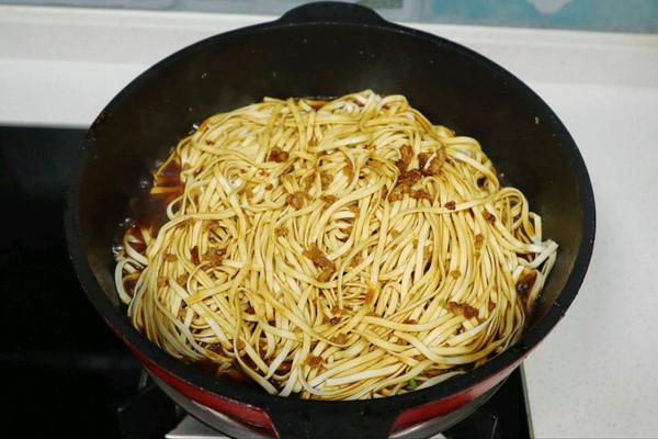 打开盖子,等焖面热气散去,晾一会再抄面条抖散,这样面条不粘不断