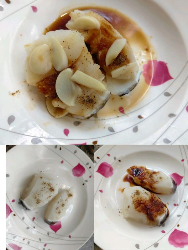 2、撒上适量的盐、黑胡椒粉,放上生抽,再把蒜片放在鳕鱼上,静置腌制约5-10分钟,让其入味。