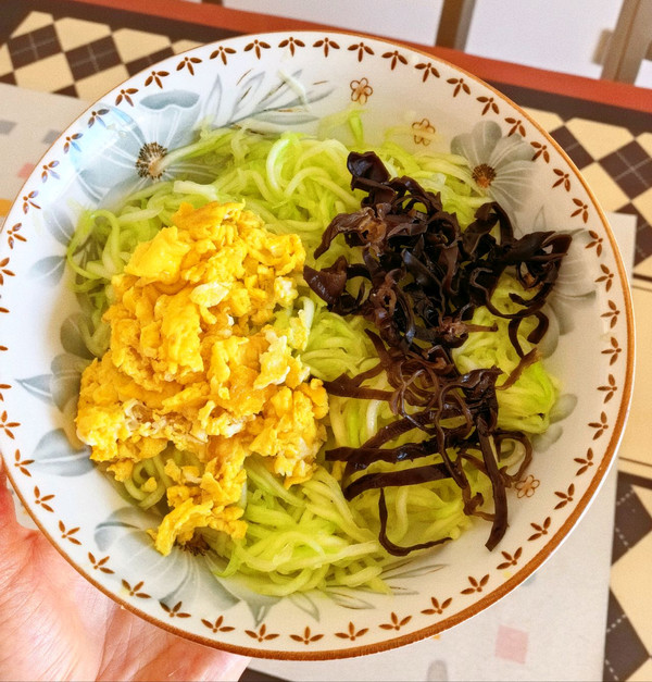 鸡蛋下锅炒散,木耳泡好切丝备用。
