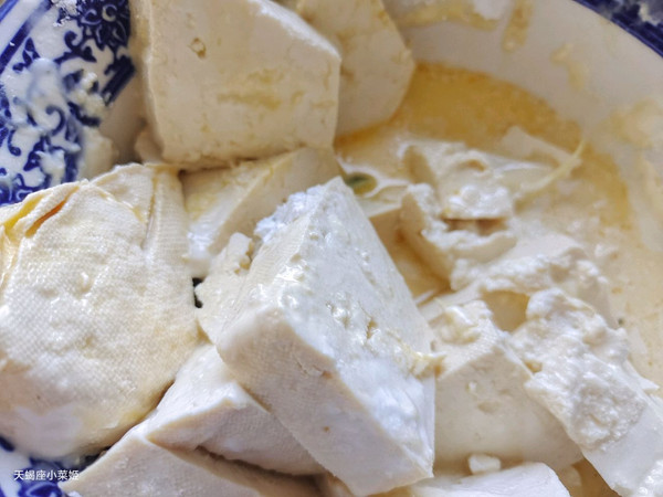 豆腐切块,放入大碗内,加入玉米淀粉和鸡蛋,清水上浆