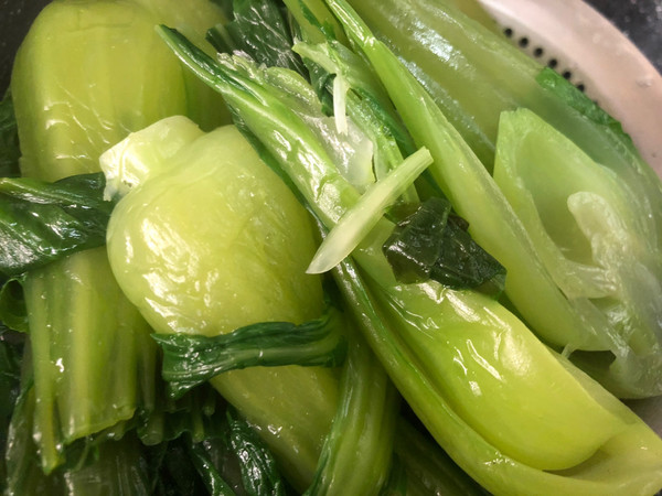 锅中加入油菜帮焯水1.5分钟,然后加入油菜叶焯水半分钟。