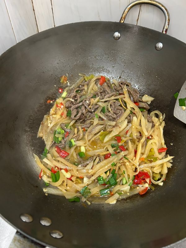 萝卜牛肉切丝,牛肉放米酒生抽淀粉白胡椒腌,面上放点油封一下,不用放盐
