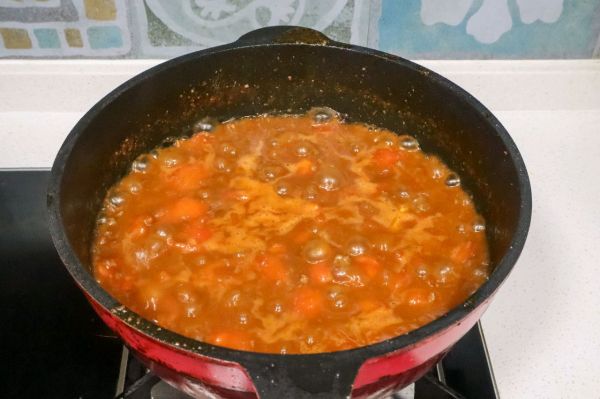加入番茄翻炒,适量水,盐,糖,十三香,白胡椒粉,老抽,生抽,炒至番茄变软关火