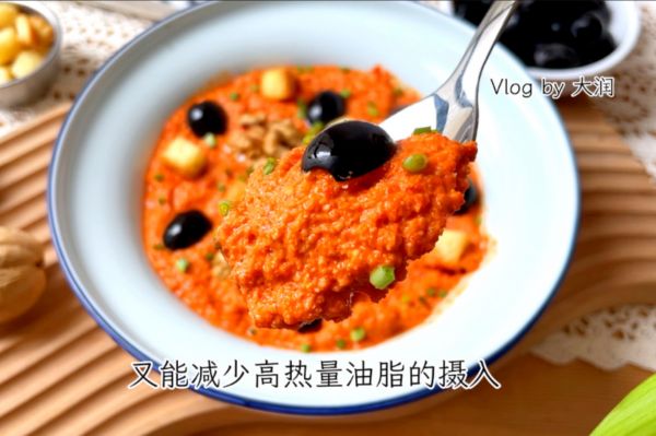 准备食材:西班牙黑橄榄6颗,红甜椒 2个,核桃仁 50克,大蒜1辦,甜椒粉1茶匙,孜然粉 1茶匙,盐1克,橄榄油1茶匙,面包干少量,细香葱少量