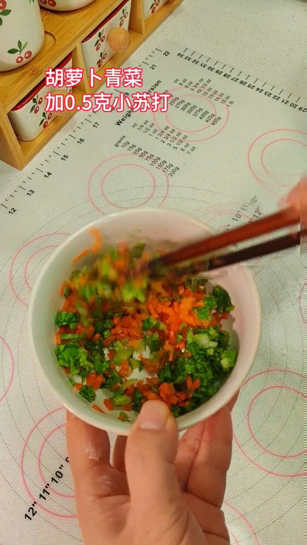 青菜胡萝卜切碎加0.5克小苏打(防止变色用)