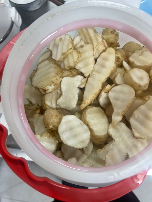 找一个干净的桶,里面倒入少许白酒,摇匀,让桶壁上沾满酒。酒是可以杀菌的。把洋姜片装入桶,倒入烧好的调料,封口放置冰箱冷藏2天后就可以吃了。
