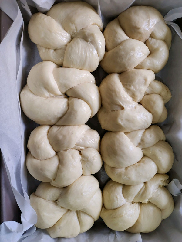 取9份差不多130克左右的面剂子,盖上保鲜膜松弛10分钟,取出一个松弛好的面团,将面团从中间向上下两边擀开,然后向做吐司一样从上往下卷,卷好后挫成长条,将长条围着4根手指绕一圈,然后上下穿梭两下,将两个头连在一起(具体的可以网上搜老式面包的整形方法)我的烤盘太窄所以只放了8个,如果是28×28的方形烤盘可以放9个面剂子,