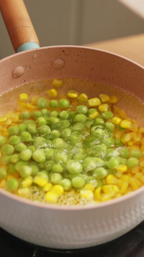 圣女果切丁,然后跟熟玉米粒、熟豌豆粒混合在一起。