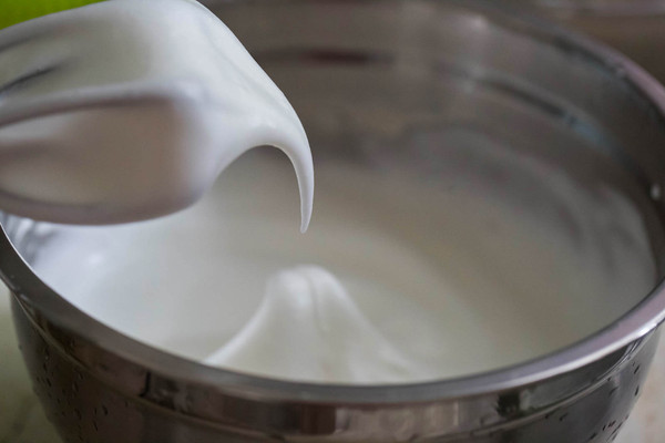 预热烤箱,往蛋清中加入柠檬汁和一半细砂糖高速打发至有纹路,再加入剩下的细砂糖转中速打至大弯钩状;