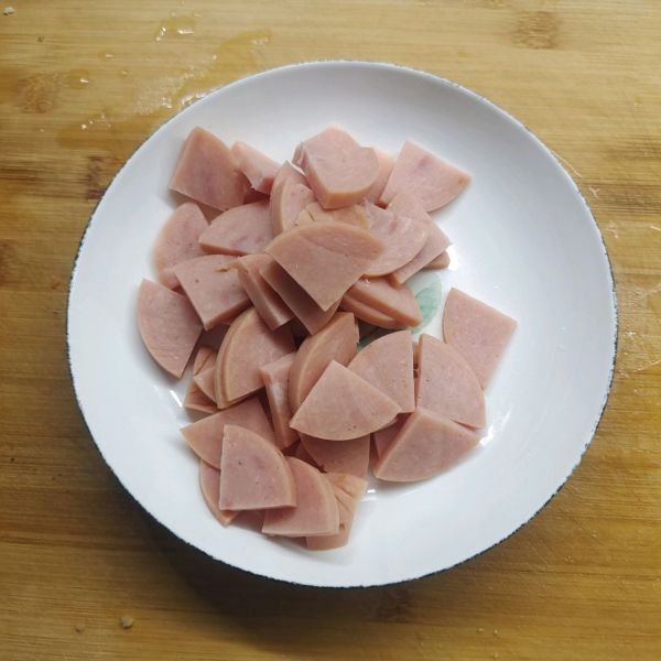 炒锅预热,放入切好的火腿香肠片爆香,盛出备用。