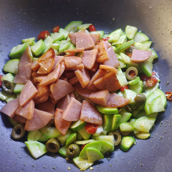#西班牙橄榄中式创意菜#西班牙青橄榄西葫芦炒香肠(