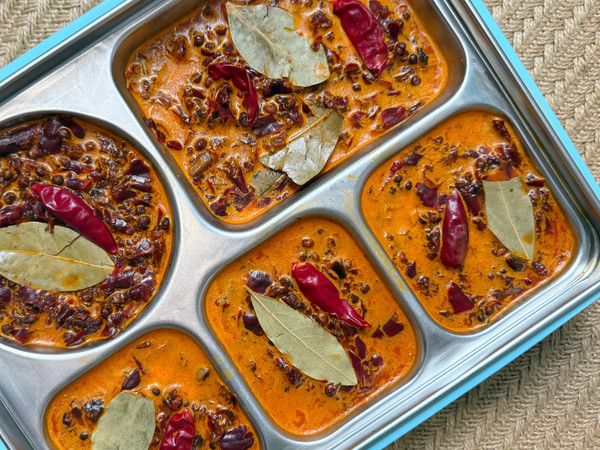 然后放入香料和花椒,翻炒均匀后小火慢熬 20 分钟,让香料的味道充分融入底料中