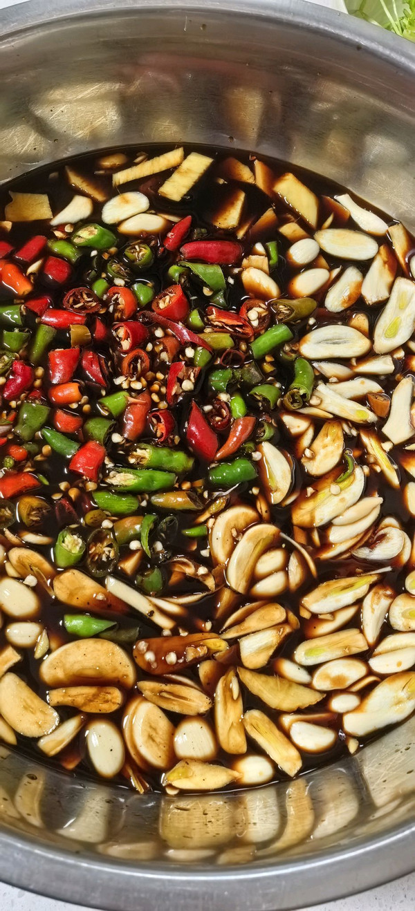 姜蒜切片,小米辣切段,把所有调料兑成一盆备用。