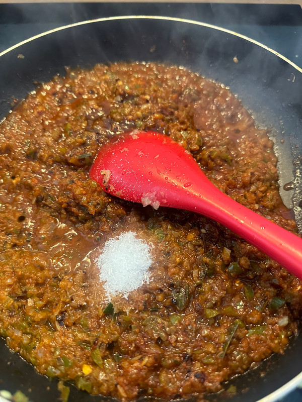 油多放一点、放入洋葱碎、青椒碎、和蒜