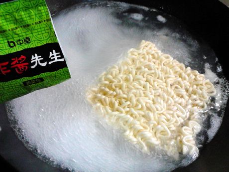 同时,不断用筷子将面饼拨散,使面条与水充分接触。