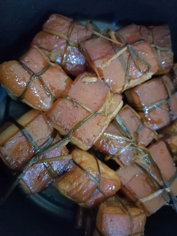 五花肉洗净烙皮焯烫去血沫后煮40分钟切成方块,逐个用粽子绳捆好