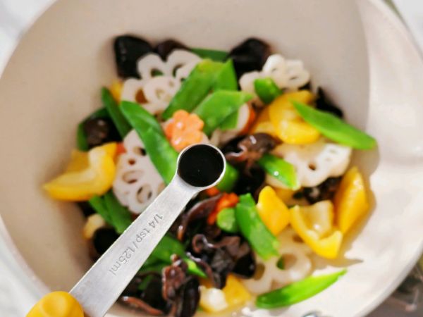 接着放入所有蔬菜快速翻炒几下 加入一小小勺生抽调味