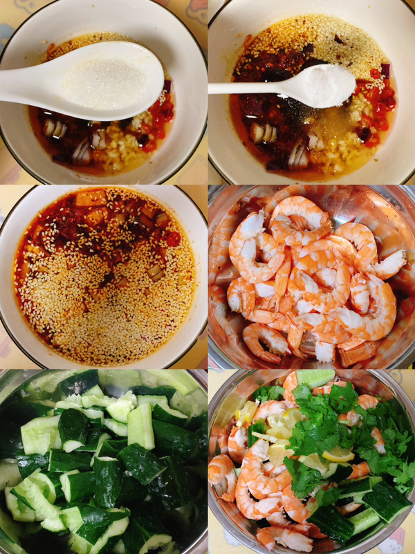 碗中放虾,黄瓜,柠檬片,香菜淋入酱汁抓拌均匀即可!