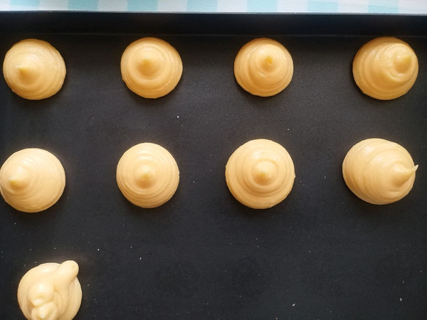 裱花袋放上裱花嘴,把面糊倒入裱花袋;