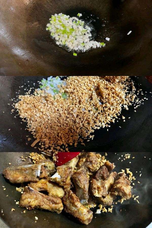 锅留少许底油下洋葱,青椒丁炒香关火下炸好的黄金蒜末和排骨,翻拌均匀。