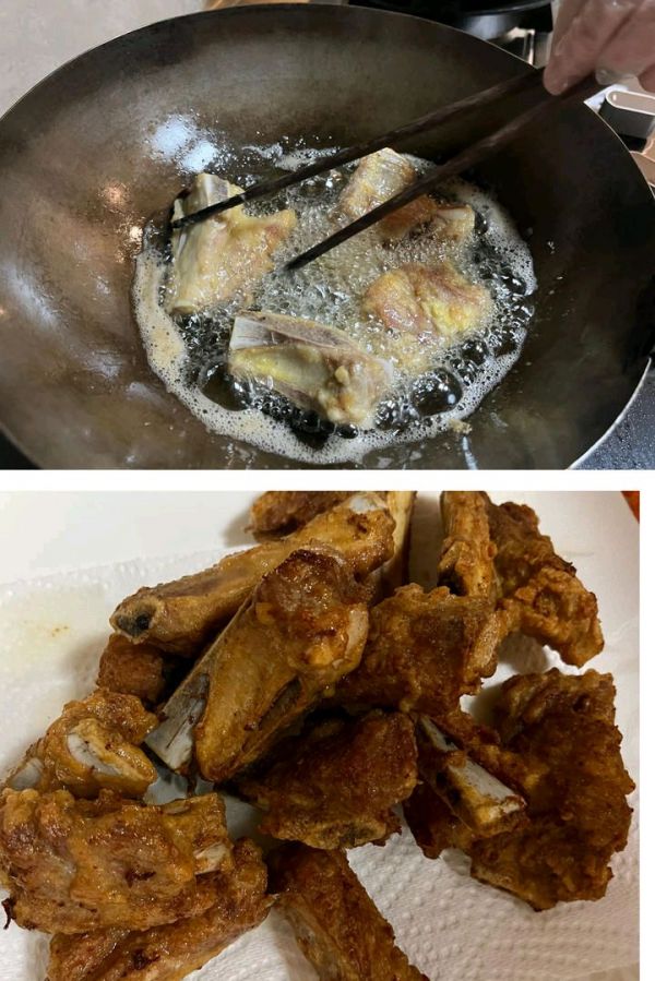 蒜油六成热下锅小火慢炸,炸至金黄捞出(10分钟左右)用猪小排肉嫩