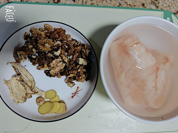 备好食材:两片当归、姜片、核桃仁、鸡肉块