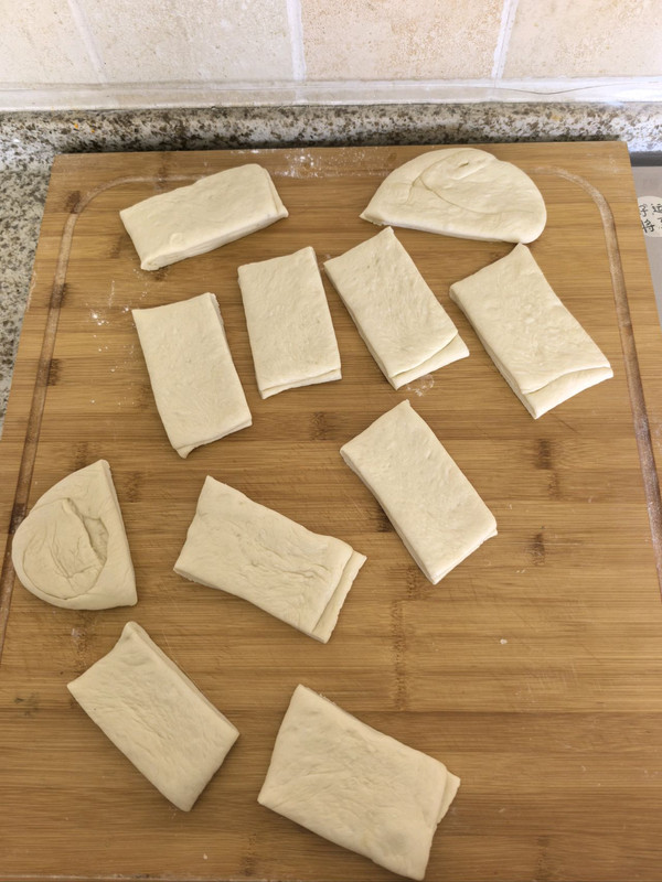 拿擀面杖在稍微往薄擀一下,然后切成大小一样的小长方形。
