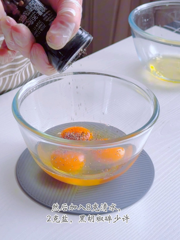 接着我们来炒鸡蛋,我们磕3个鸡蛋,留出一个蛋清,一会儿用到饺子皮里面,3个鸡蛋去掉蛋壳和一个蛋清的重量大概是126克,加入2克盐,黑胡椒碎适量,7克清水,这样一个是让鸡蛋更嫩滑,一个是去腥入底味
