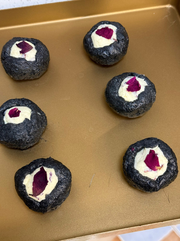 低筋面粉100克,竹炭份5克,白糖10克、黄油40克,鸡蛋液50克成团,再分6个剂子