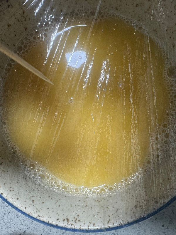 封上保鲜膜,用牙签扎几个小孔,然后放入蒸锅先蒸15分钟让鸡蛋羹定型。
