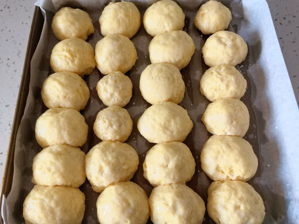 将松驰好的小面团再次滚圆(操作全程面团始终盖保鲜膜,避免风干)放入烤盘。