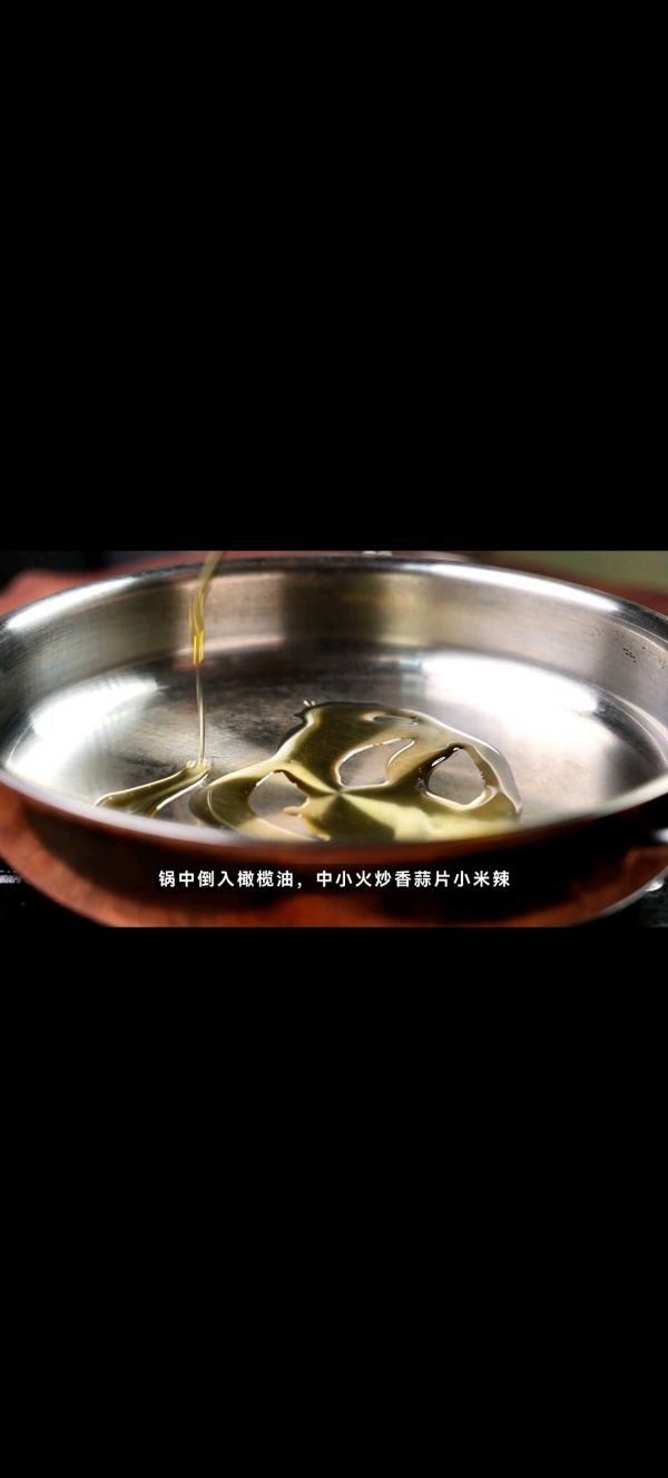 锅中倒入橄榄油,中小火炒香蒜片,小米辣。