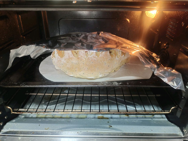 最后10分钟的时候观察一下欧包表面颜色,颜色金黄后,及时加盖锡纸,以免颜色过深,不好看!