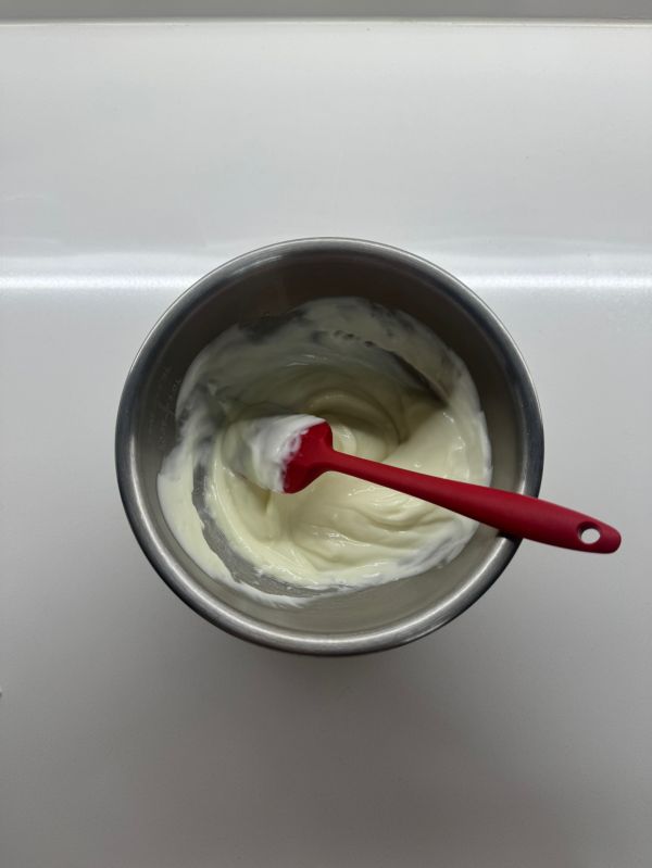 11 趁着蛋糕晾凉的间隙制作雪顶奶盖,将酸奶油100克加入浓缩柠檬汁5克、糖粉20克,搅拌均匀备用。