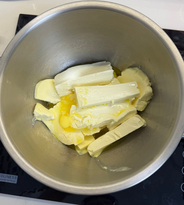 7 将软化的奶油奶酪和黄油低速搅打均匀,1档速度即可。