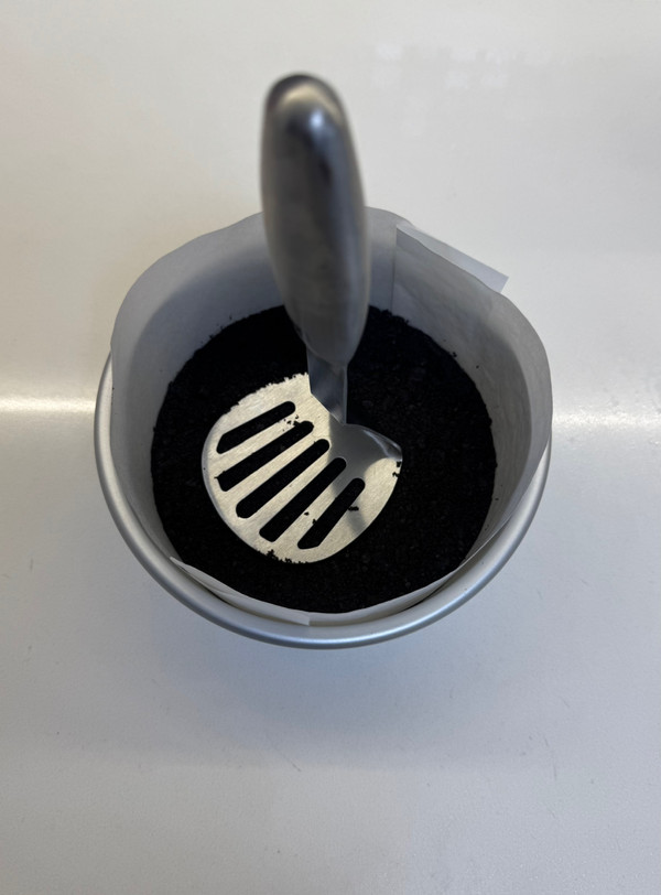 4 将奥利奥碎倒入铺好硅油纸的蛋糕模具并压平压实(厚度均匀)。