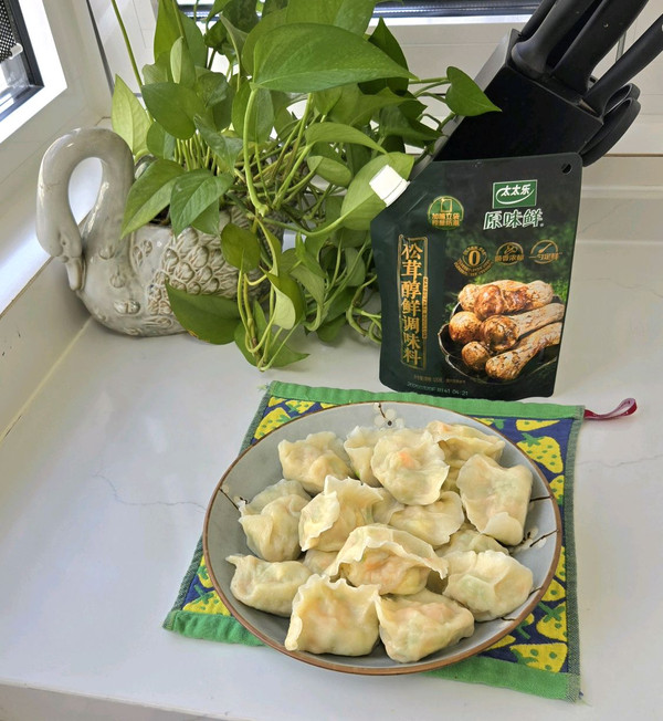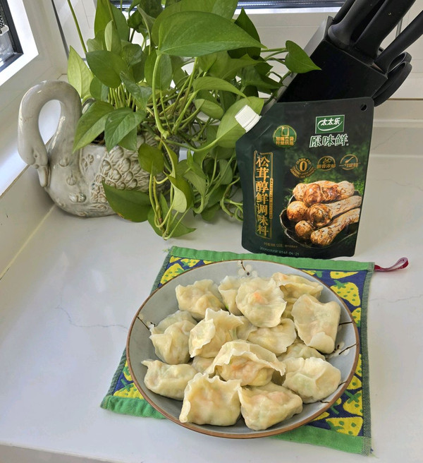 装盘 外皮柔韧劲道 內馅鲜香可口的松茸鲜虾仁鸡蛋西葫芦水饺 搭配个啤酒非常惬意 好吃的让你停不下来…