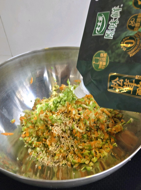 放入香葱花 姜末 盐 糖 太太乐松茸醇鲜调味料 芝麻香油拌匀入味增鲜…