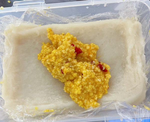 大黄米提前一晚浸泡,然后捞出,再倒入250克清水,放入蒸锅中。 麻薯材料混合均匀后,倒入铺了保鲜膜的盒子中,放入蒸锅中。 水开后蒸30分钟。
