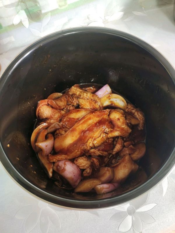 切好的肉放入电饭锅内胆中,再放入生姜,洋葱,甜酒汁儿(甜酒汁儿去腥增香,还有一点甜味儿!)