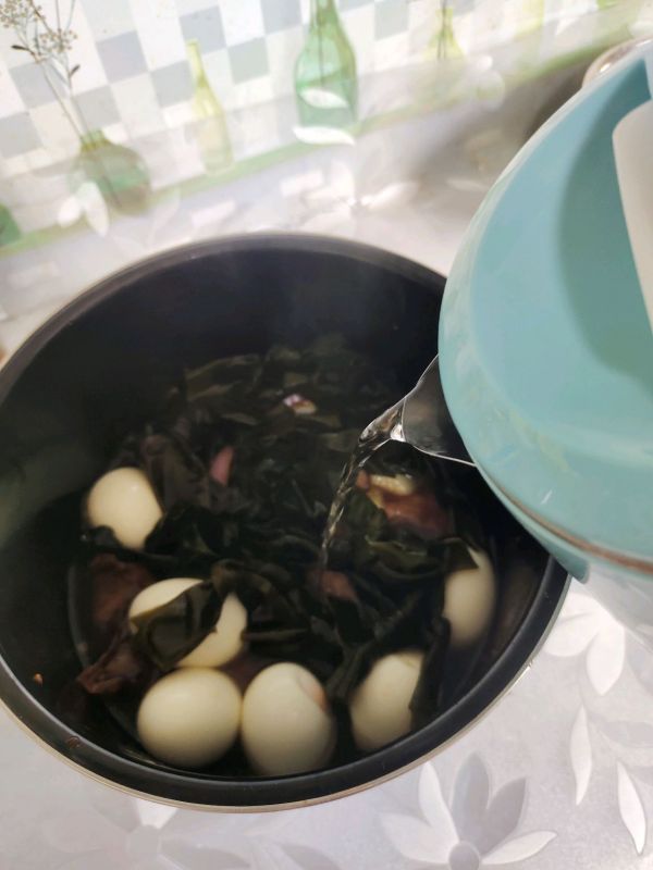 提前把海带结泡发好,清洗干净,控干水分;鸡蛋煮熟,剥壳备用!