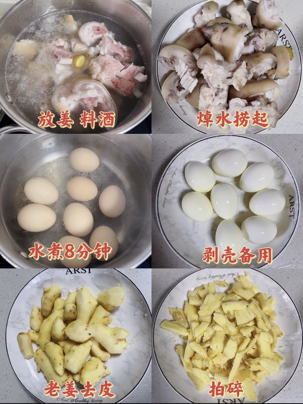 1.猪脚洗干净,加冷水,白醋,料酒掉水 2.水煮鸡蛋搞里头 3.姜去皮,拍碎,小火炒一下去辣
