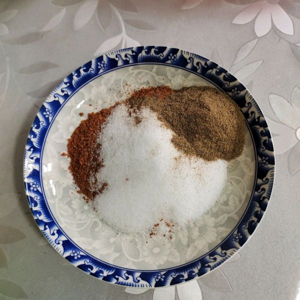 调味料:粗辣椒面,细辣椒面,花椒粉,姜粉,盐,五香粉!混合均匀!