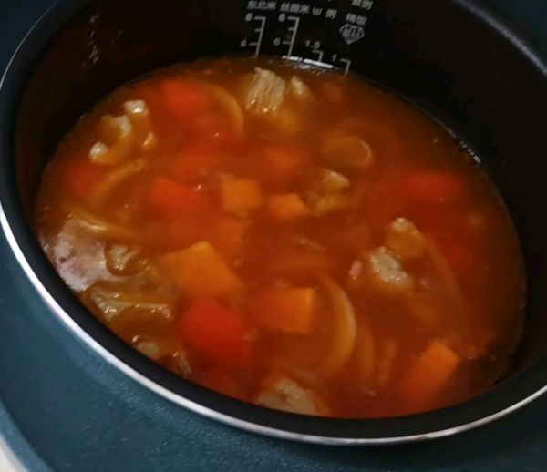 将煸炒后的洋葱、胡萝卜和南瓜倒入锅内,放适量盐,定时1个小时