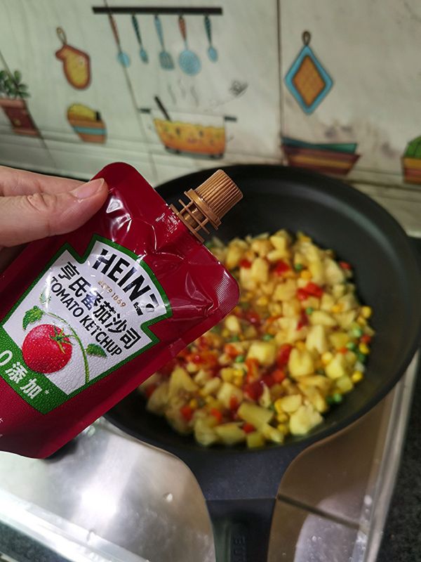 热锅倒油分别倒入土豆,豌豆,玉米粒,胡萝卜和菠萝翻炒,加入蚝油,少许白糖,翻炒到菠萝变软出香味。