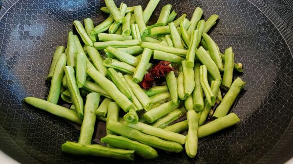 开火热锅淋圈油倒上掐头去尾撕老筋收拾干净掰大段的四季豆