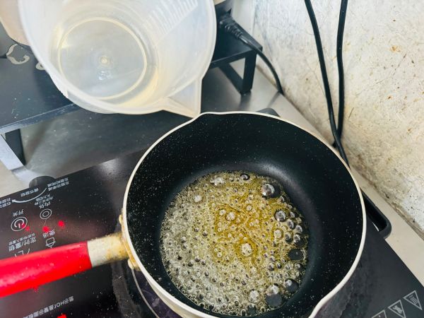 加入30克热水(离远一点避免烫到)轻轻晃动锅子混合均匀