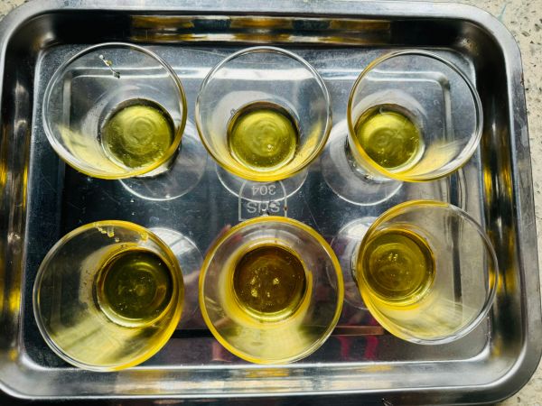 过筛好的液体,倒入布丁杯中,并用小勺子刮掉表面小泡泡